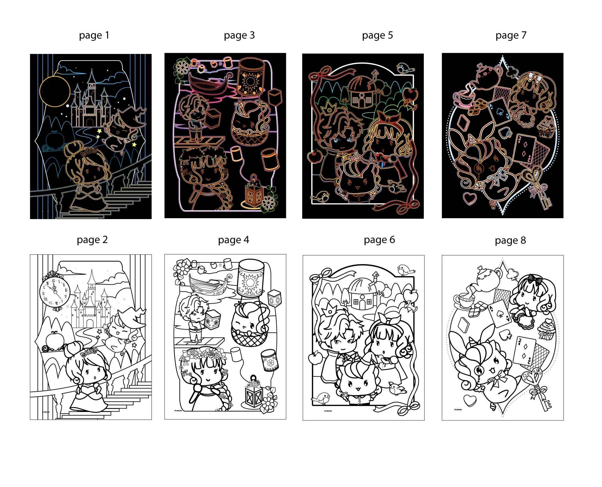 Scratch and coloring book includes 4 scratch pages + 4 coloring pages + 3 rainbow sheets