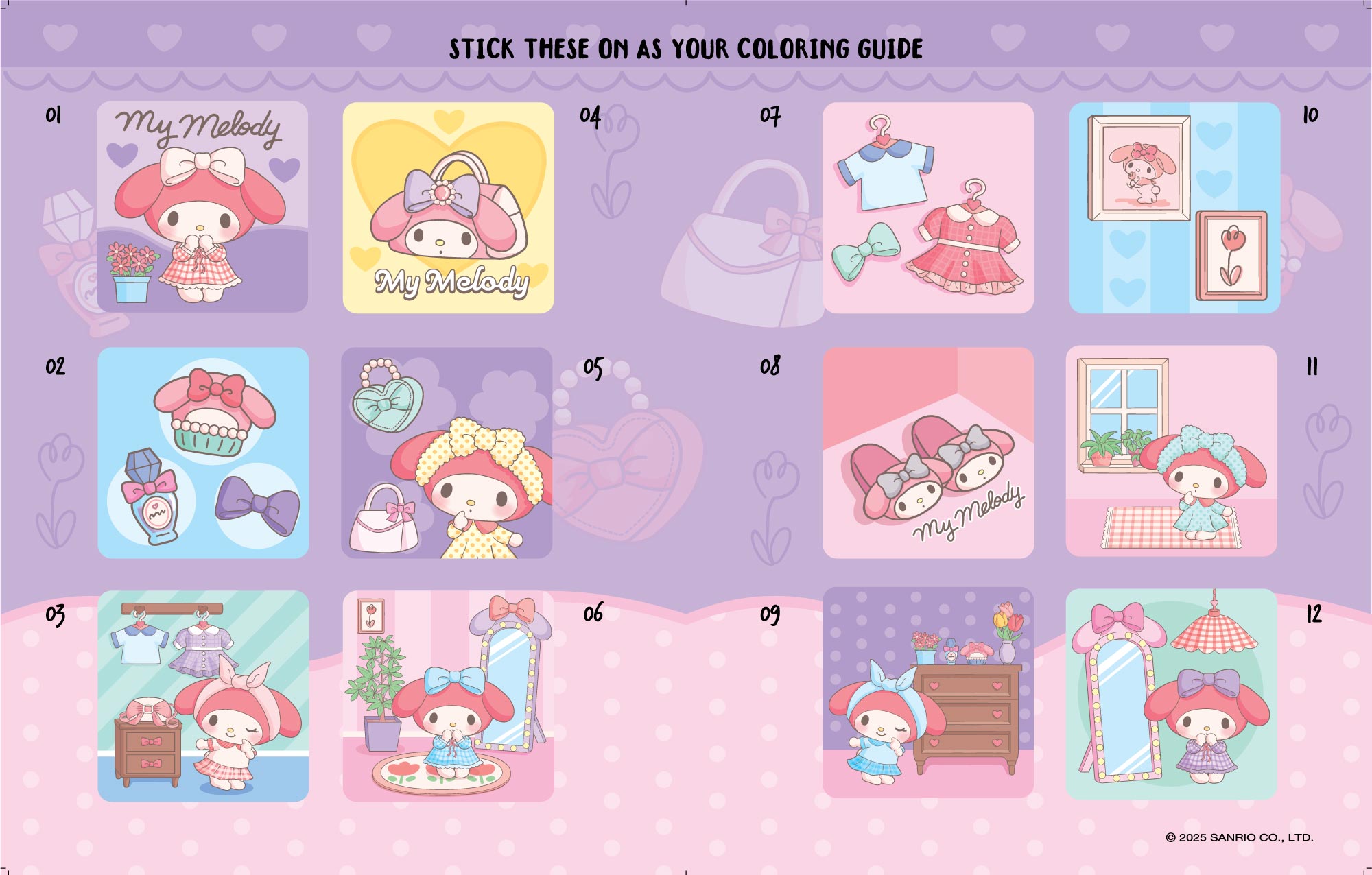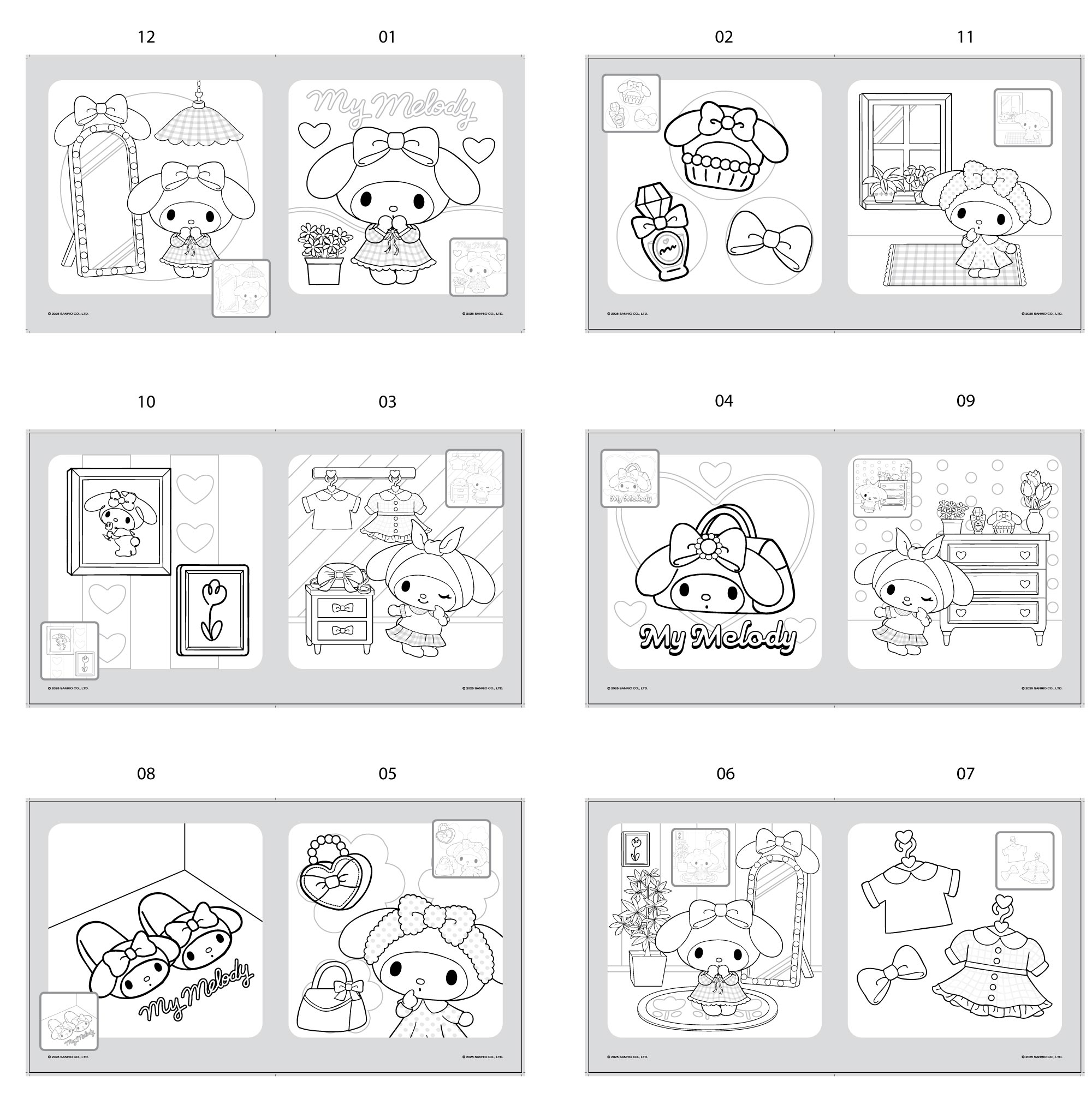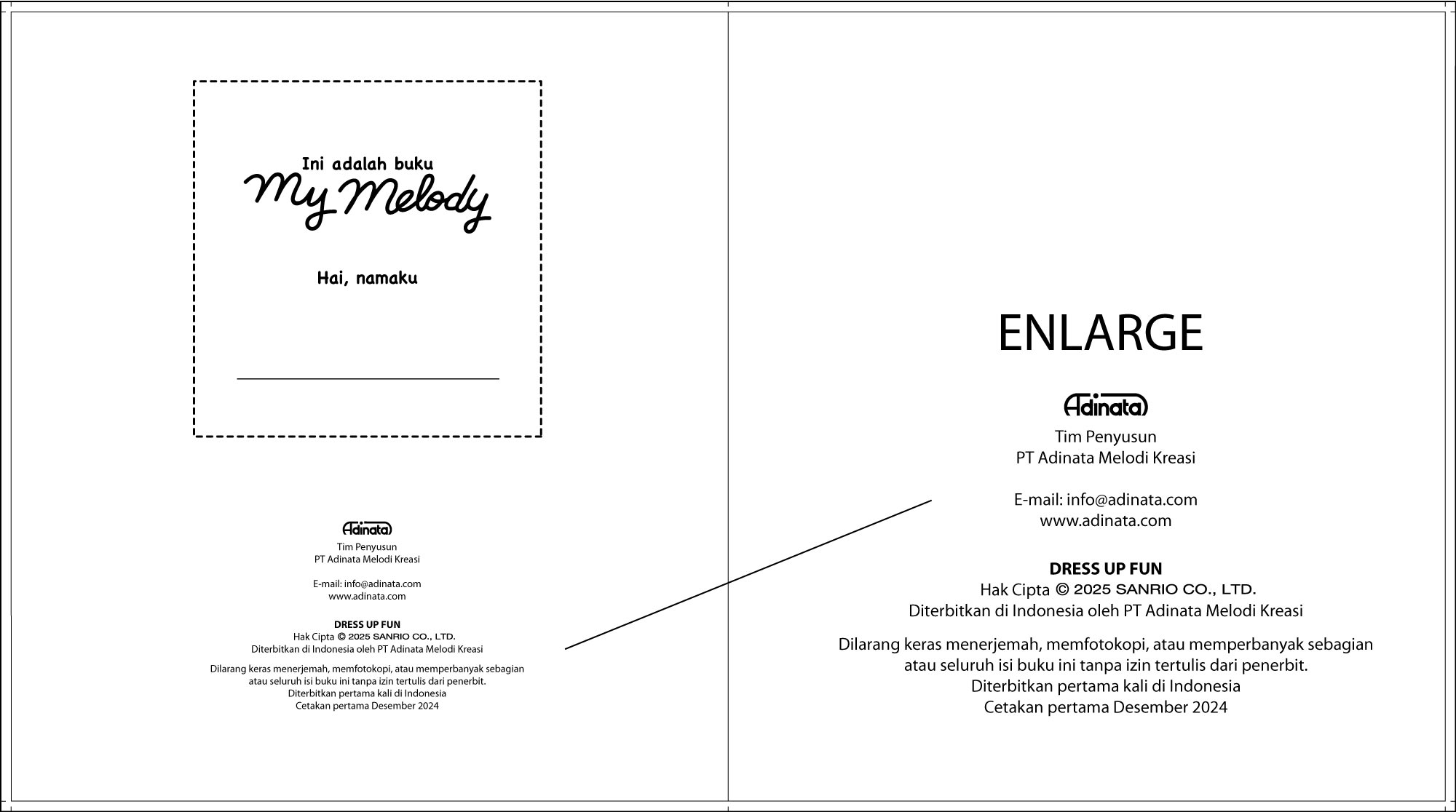 Buku mewarnai My Melody berjumlah 12 halaman inner BW dan bonus sticker