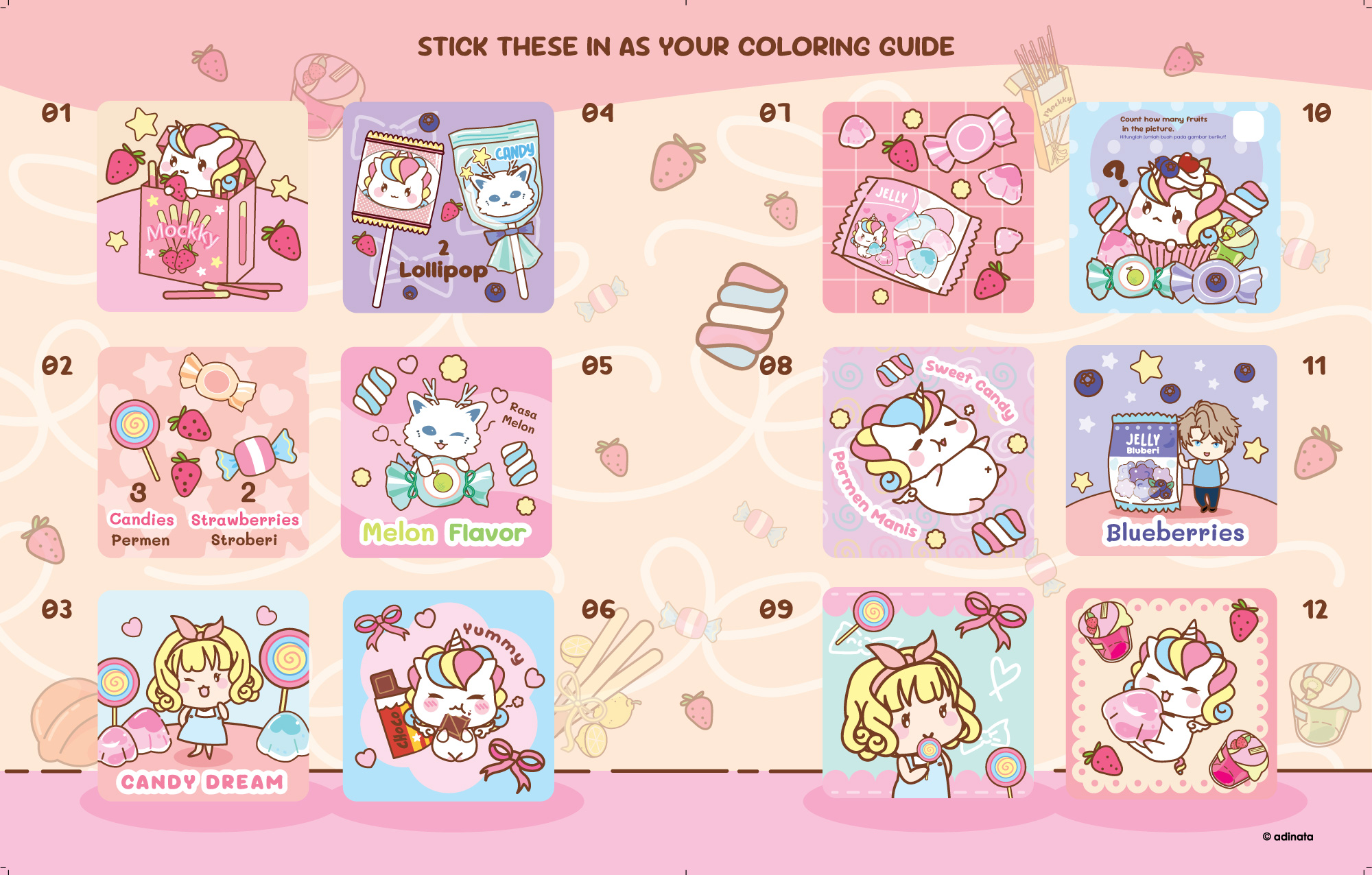 Buku mewarnai Kuromi berjumlah 12 halaman inner BW dan bonus sticker