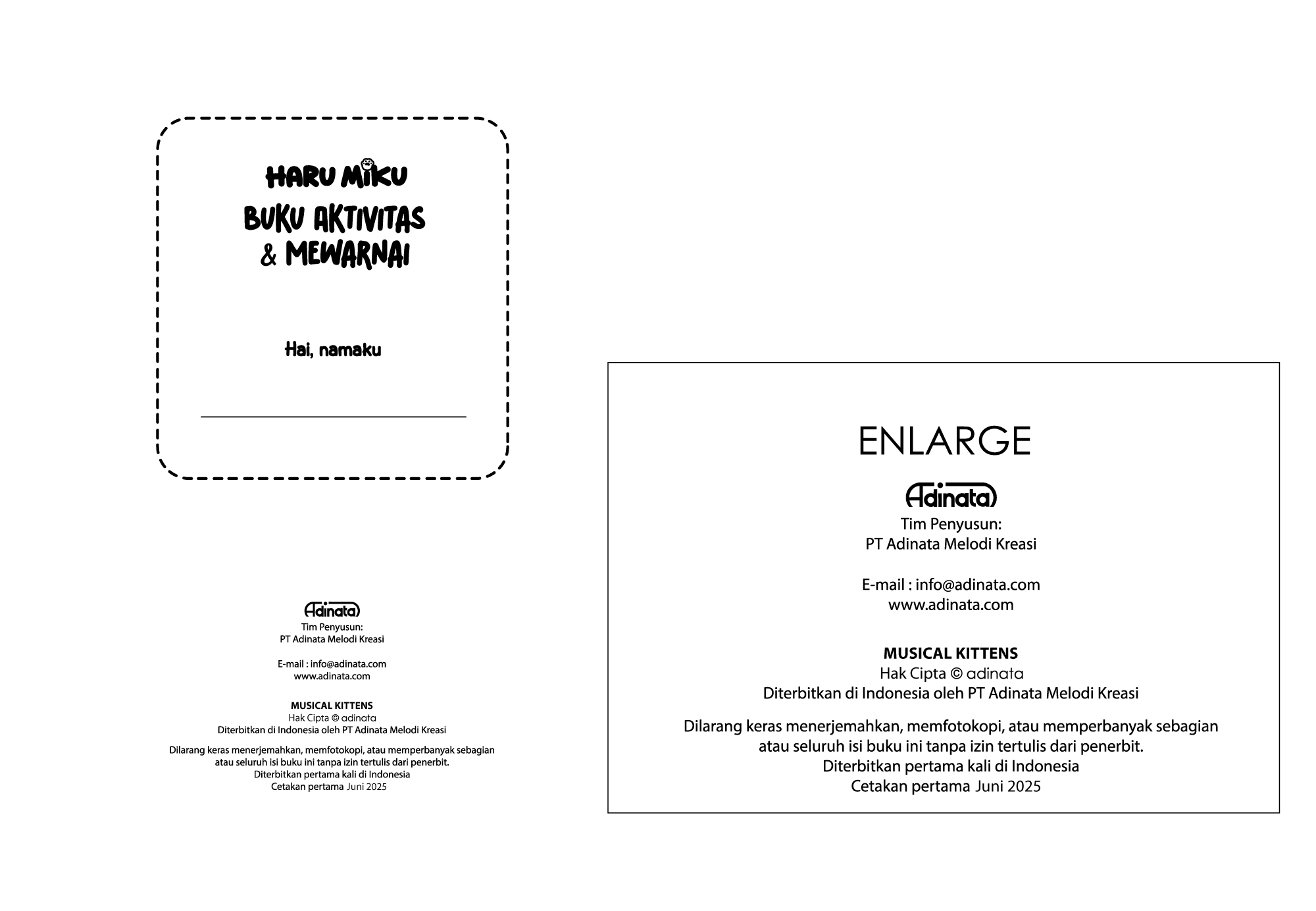 HMABL 2552-9822 Judul: MUSICAL KITTENS -- Buku Aktivitas dan Mewarnai dengan ukuran besar cocok untuk anak usia 4 tahun ke atas.Kelebihan produk ini :-Ketebalan kertas : 80 GSM- Berwarna dengan gambar-gambar yang menarik- Gratis Stiker- Terdiri dari 20 Halaman