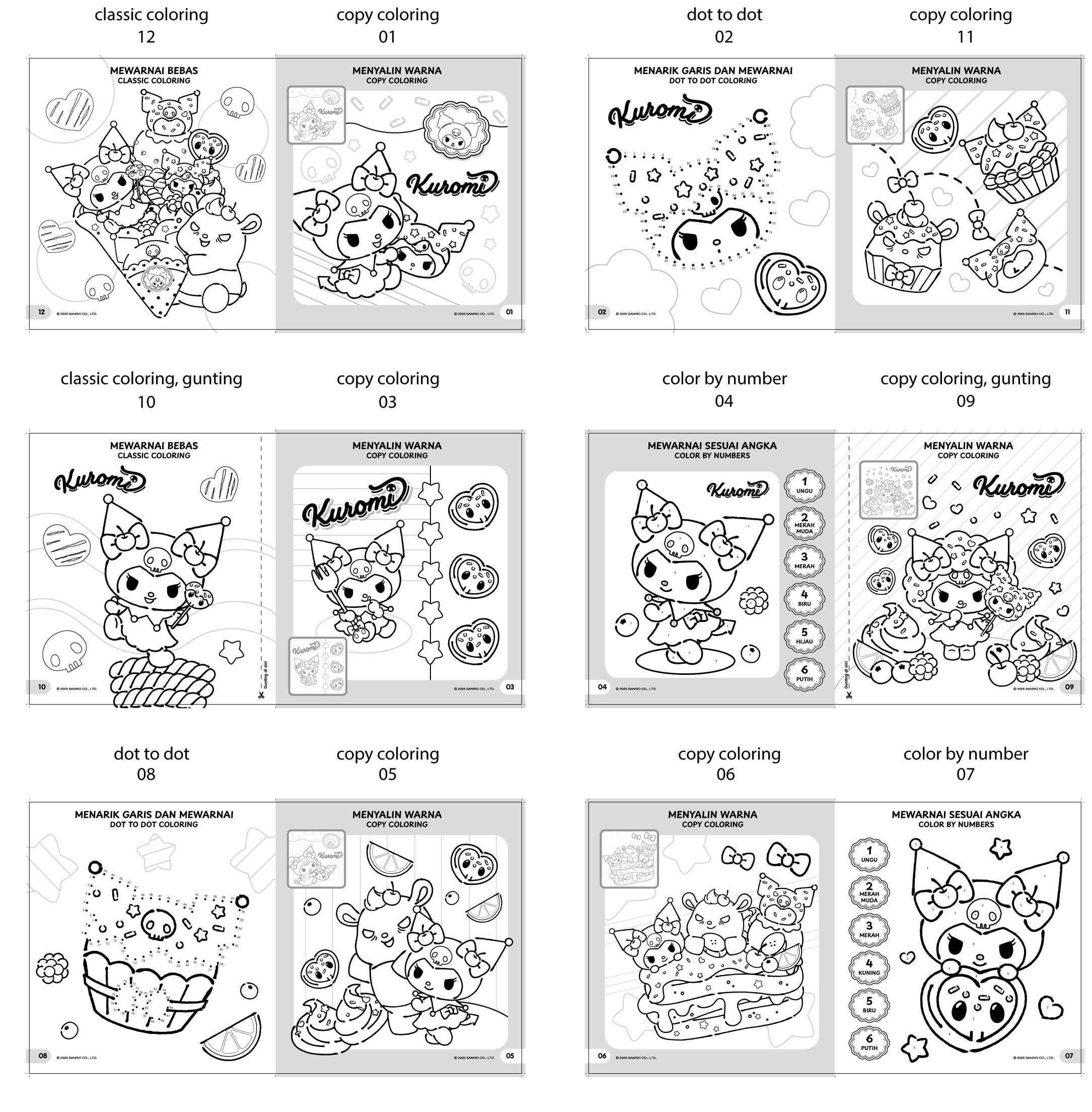 Buku mewarnai Kuromi berjumlah 12 halaman inner BW…