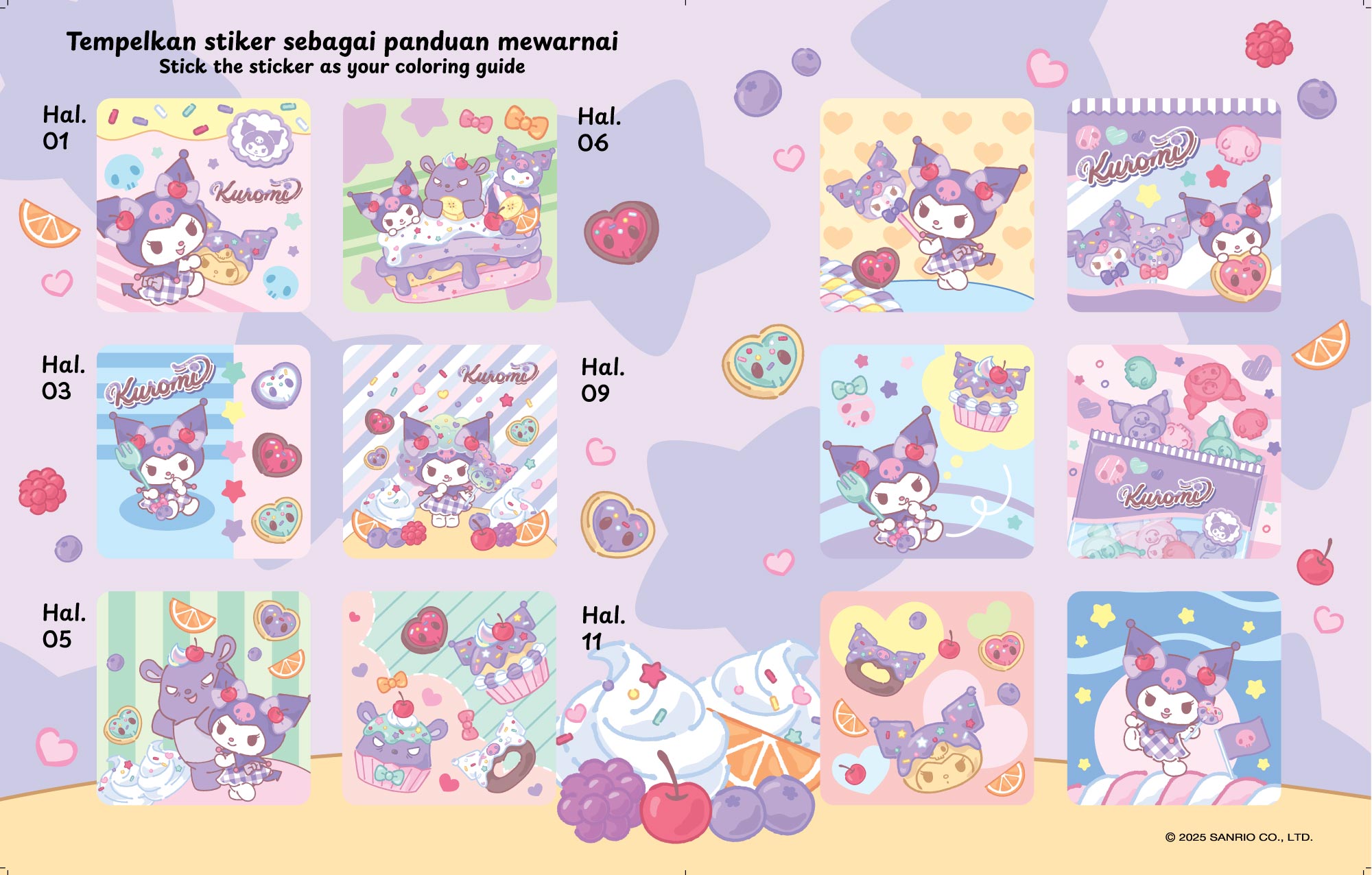 Buku mewarnai Kuromi berjumlah 12 halaman inner BW dan bonus stiker