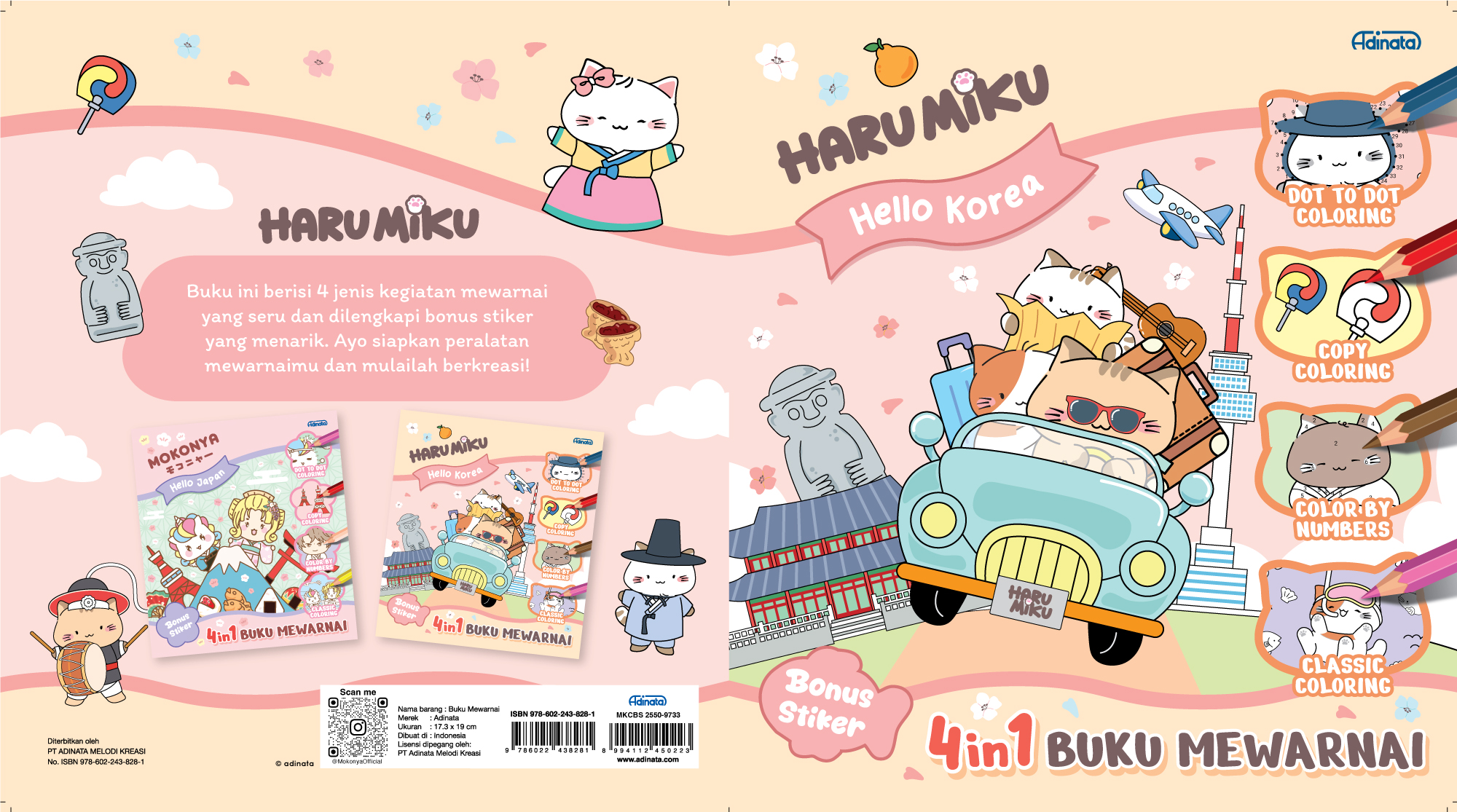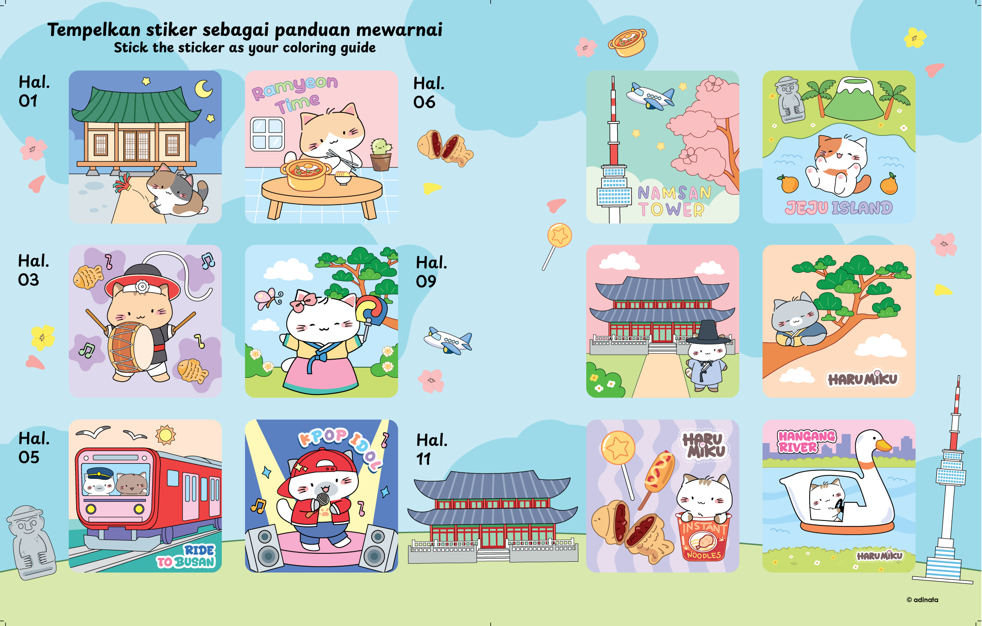 Buku mewarnai Harumiku berjumlah 12 halaman inner BW dan bonus stiker